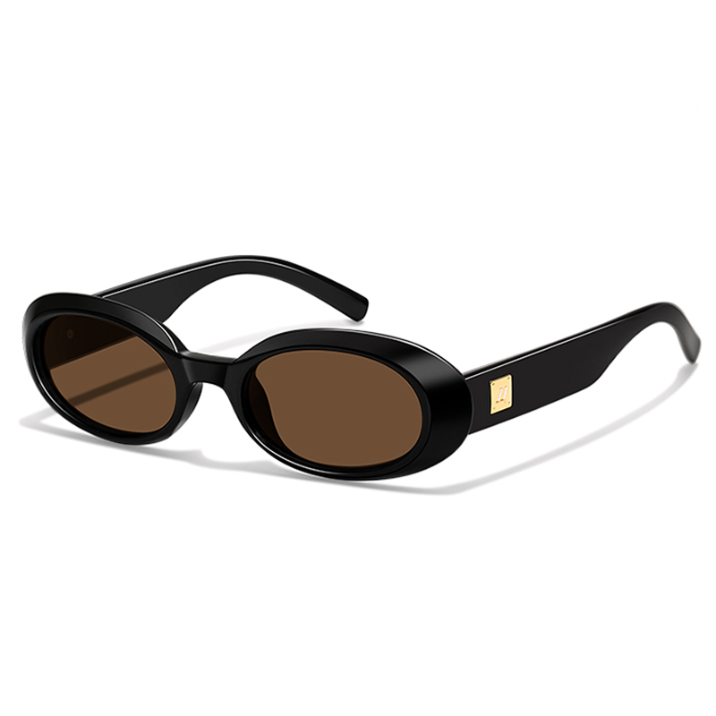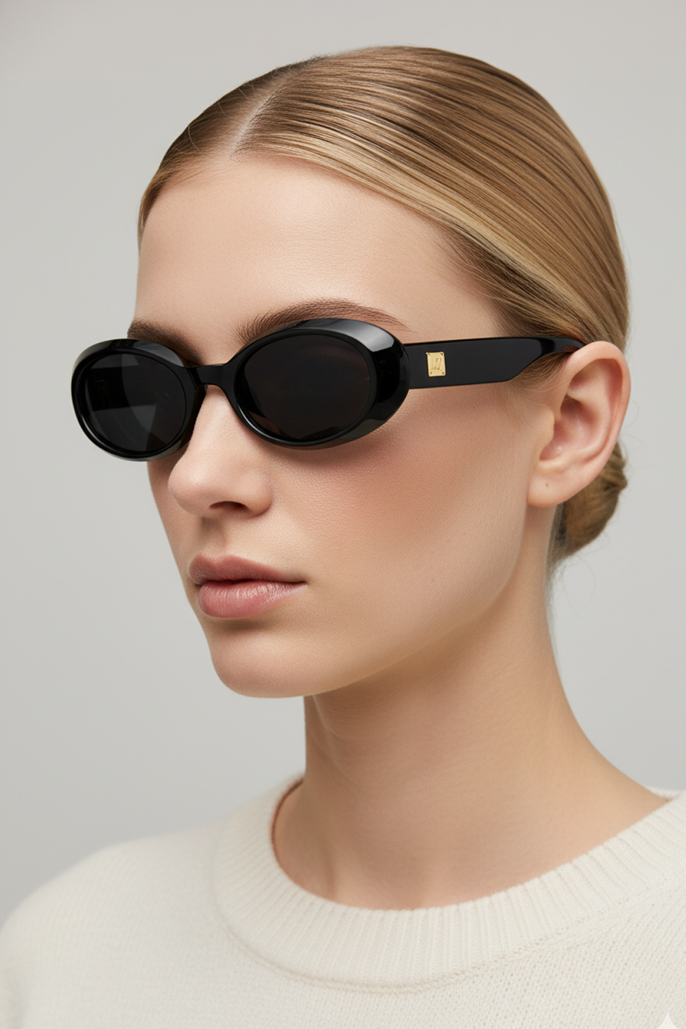 T03 Chunky Oval Sunglasses – Retro 90s Black Frame with Gold Logo Detail